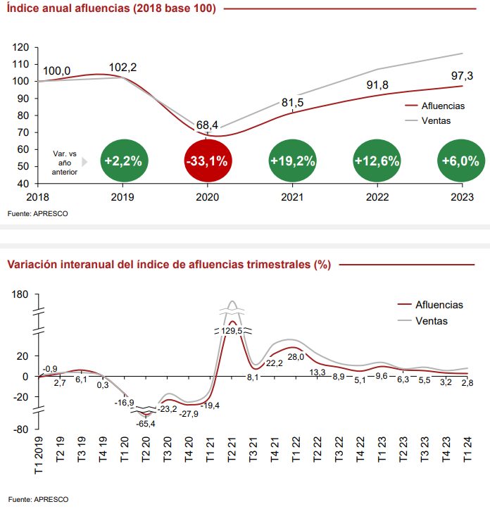 Por su parte, las afluencias a estos recintos volvieron a crecer en 2023 (+6%) y continúan haciéndolo durante el primer trimestre de 2024 (+2,8%), situándose ya muy cerca de los niveles registrados en 2019 (-3,5% vs T1 2019).