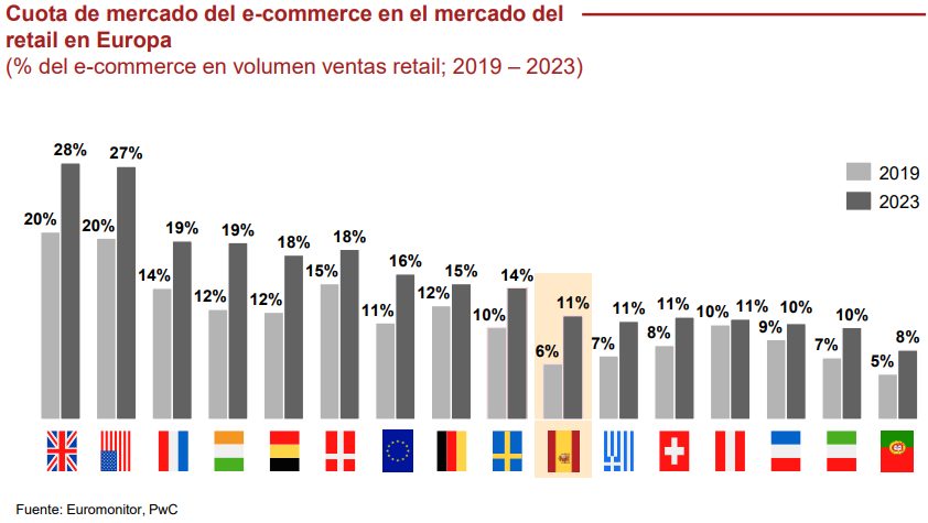 De hecho, la cuota de mercado en retail online en España es 5 puntos inferior a la media de la UE y más de 15 puntos inferior a la de Estados Unidos y Reino Unido.