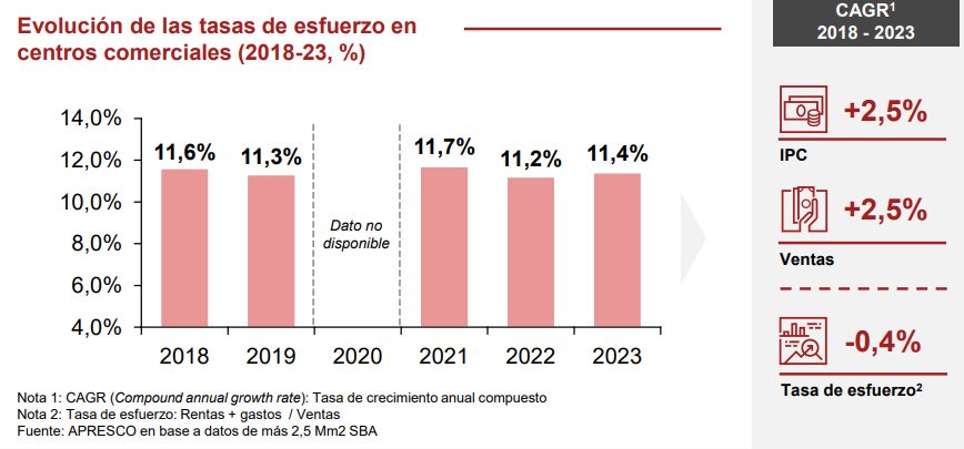 El buen comportamiento de las ventas durante estos últimos años (+2,5% anual), unido a la capacidad del sector de elevar las rentas en línea con la inflación ha permitido que las tasas de esfuerzo de los operadores se hayan mantenido en el entorno del 11% en línea con los datos observados antes de la pandemia. El esperado crecimiento del consumo y de las ventas de retail hace prever que las tasas de esfuerzo seguirán manteniéndose al menos en los niveles actuales durante 2024 y 2025.