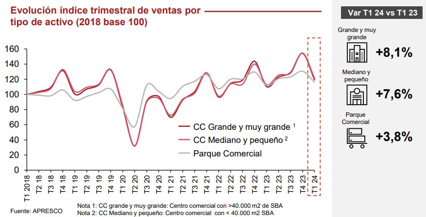 ventas en torno a un 8%. Por su parte, los parques comerciales, que fue el activo que mejor se comportó y antes se recuperó de la pandemia, incrementaron sus ventas un 3,8% respecto al primer trimestre de 2023.