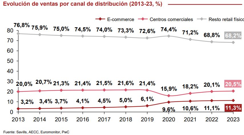 Frente a ello, los centros comerciales han mostrado gran resiliencia, recuperando la caída de su cuota durante la pandemia hasta situarse incluso por encima de los niveles de hace 10 años. Por su parte, el retail físico (High Street, grandes almacenes, etc.), excluyendo los centros comerciales, ha visto reducida su cuota de mercado en 8,4 puntos porcentuales fundamentalmente como