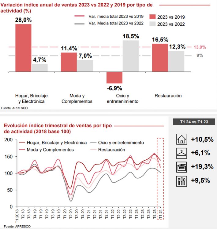 El incremento de ventas ha sido generalizado en todas las categorías, que han mostrado un comportamiento muy positivo, destacando el ocio y la restauración que fueron las que más sufrieron durante la pandemia. La celebración de la Semana Santa en el mes de marzo, a diferencia del año pasado cuando fue en abril, ha podido tener un efecto positivo en la comparación de las ventas con respecto a 2023.