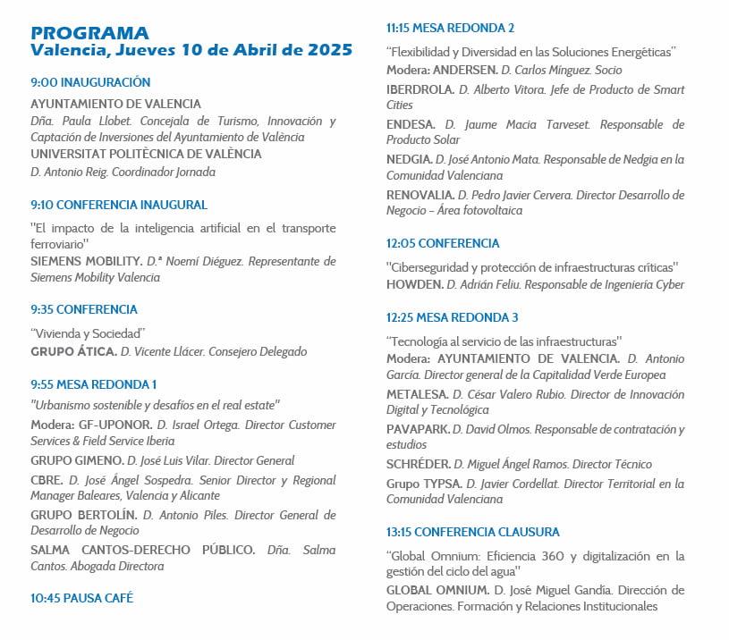 Esta jornada se posiciona como un punto de encuentro clave para profesionales del sector, impulsando soluciones innovadoras para el desarrollo de ciudades más seguras, eficientes y sostenibles. Entre los participantes del evento se encuentran grandes firmas como Uponor, Grupo Gimeno, CBRE, Grupo Bertolín y Salma Cantos; también Iberdrola, Endesa, Nedgia y Renovalia.
