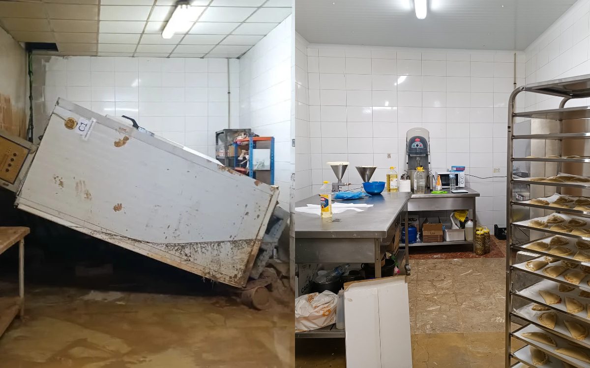 A la izquierda, el obrador del Horno La Torre tras ser arrasado por la DANA. A la derecha, el obrador reformado.