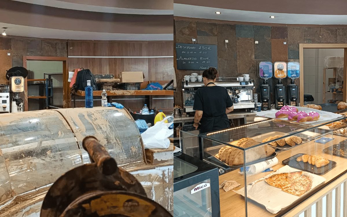 A la izquierda, el mostrador cubierto de barro el 4 de noviembre de 2024. A la derecha, una dependienta sirve cafés junto al horno ya abierto el 9 de abril de 2025.