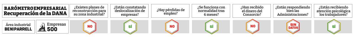 Leonardo García, presidente de la Asociación de Empresarios de Beniparrell (Aembe), explica que no conocen ningún plan de reestructuración. Los daños sufridos por la DANA se han focalizado en los colectores y ya los están reparando. «Sabemos que desde el Ayuntamiento están aprovechando también para reparar el asfaltado de aquellos polígonos que ya estaban en mal estado antes de sufrir la DANA», señala. «De momento, no hay un plan establecido. Beniparrell es un ayuntamiento pequeño, y esta es una de sus debilidades, con 2.000 habitantes y más de 500 empresas», desgrana.