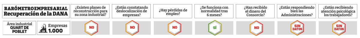 Aunque no se ha producido una deslocalización de grandes empresas, la gerente de la Asociación Empresarial de Quart de Poblet, María Ángeles Hidalgo, advierte de que «una empresa muy importante» del municipio se está replanteando cómo afrontar la etapa post-DANA. «Esta empresa se encuentra en los lindes del barranco del Pozalet y ha quedado devastada. Por ello, están instalando muros resistentes como medida antinundación para evitar que el agua entre. Sin embargo, los vecinos están descontentos y se han generado disputas», explica.