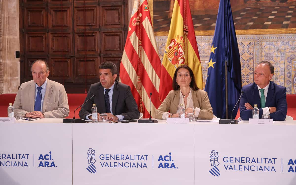 El presidente del Consejo de Cámaras de Comercio de la Comunitat Valenciana, José Vicente Morata; el president de la Generalitat, Carlos Mazón; la consellera de Hacienda y Economía, Ruth Merino; y el presidente de la CEV, Salvador Navarro. Imagen: GVA.
