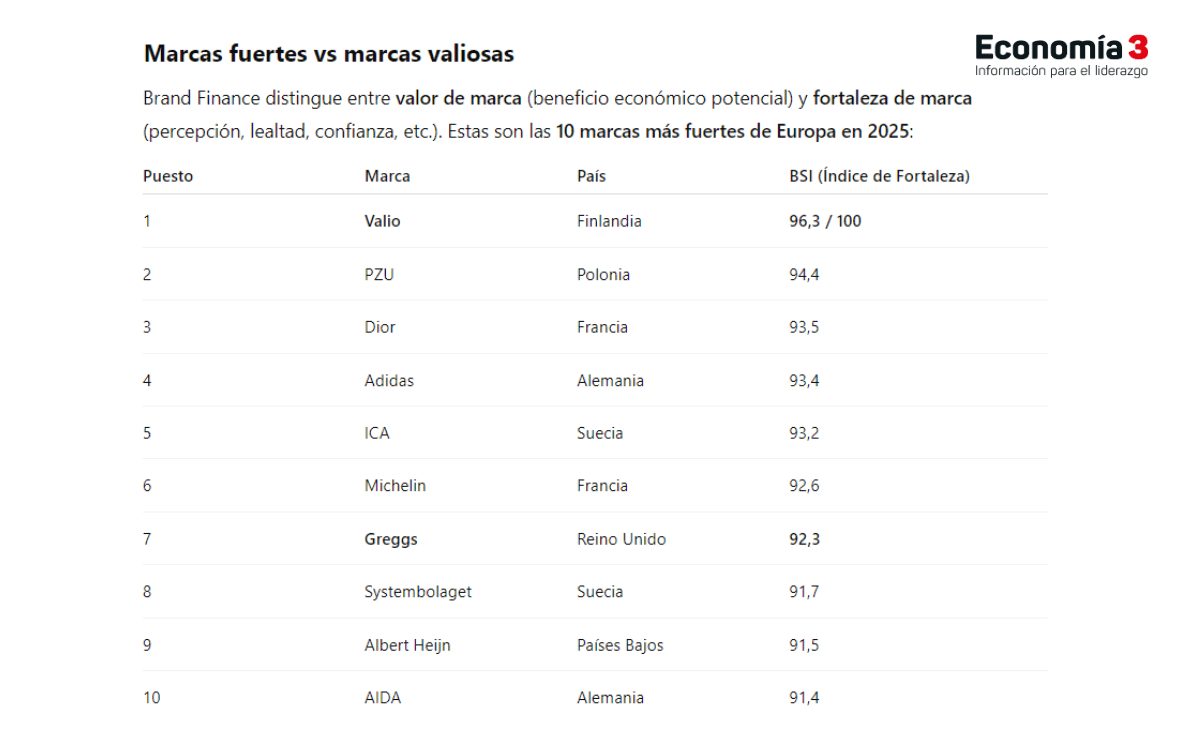 En el mismo ranking de fortaleza, destaca la aparición de la británica Greggs, la cadena de panaderías que ha superado en fuerza de marca a Ferrari, Rolex o Chanel. Con un BSI de 92,3, Greggs representa, según Brand Finance, el poder de las marcas integradas en la vida cotidiana de los consumidores: “Más del 25 % de los británicos dice amar la marca”, comenta Henry Farr, director de valoración de la firma. Esto contrasta con mercados como Francia, donde las marcas de lujo siguen dominando.