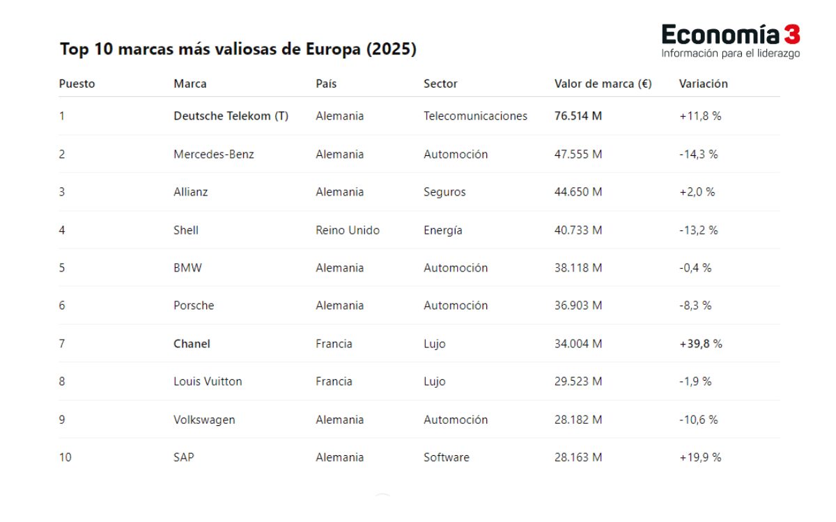 Alemania se mantiene como el país más fuerte del ranking con 75 marcas en la lista y un valor total de 616.500 millones de euros. Le sigue Francia con 85 marcas (544.100 millones) y, en tercer lugar, el Reino Unido, que con 13 nuevas entradas suma ya 383.400 millones. Esta presencia creciente de firmas británicas evidencia una transformación acelerada del tejido empresarial del país, más orientado a lo digital, los servicios financieros y la innovación tecnológica.