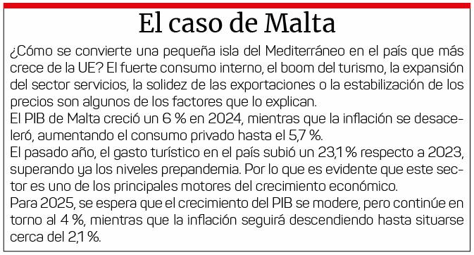 Hace unas semanas, la Comisión Europea publicaba su Spring 2025 Economic Forecast, en el que presentaba sus previsiones de crecimiento para las economías de la UE en este año y en 2026. Algunos datos de este informe llaman especialmente la atención y merecen ser destacados. El primero de ellos es que el país con mayor crecimiento previsto para este año es Malta, una pequeña isla del Mediterráneo con medio millón de habitantes. Junto a ella, los países mediterráneos –con la excepción de Italia– se sitúan entre los que se espera que registren un mayor crecimiento este año.