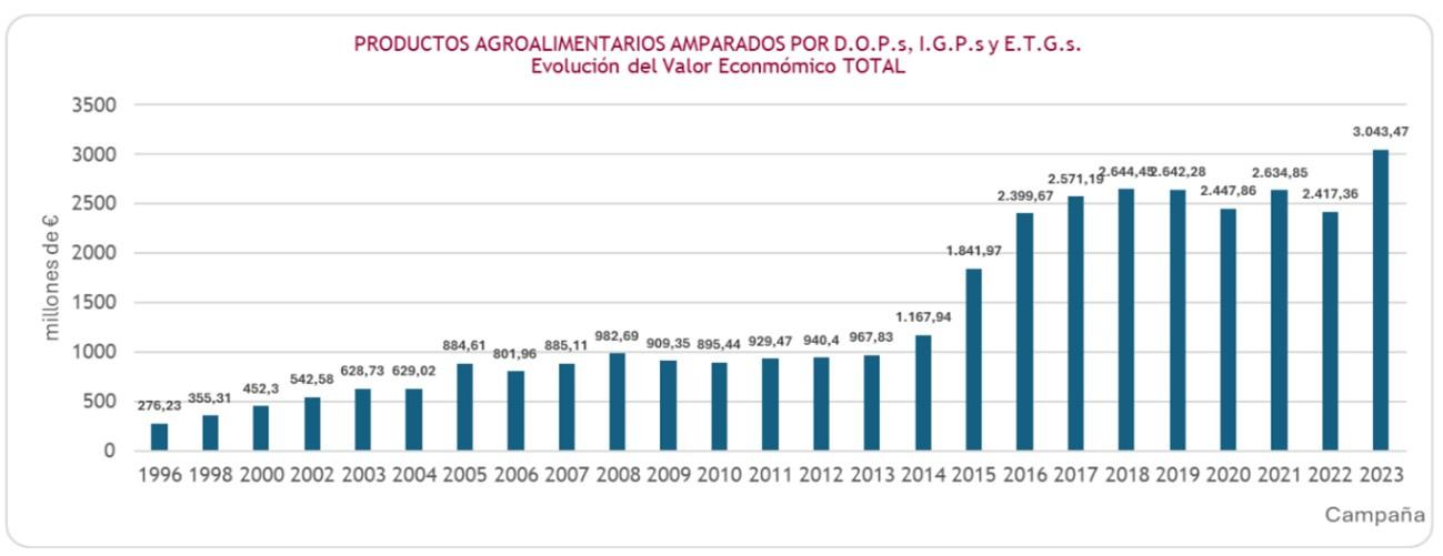 En España, el crecimiento y desarrollo exponencial de las figuras de calidad referidos a productos agroalimentarios es indiscutible. Según datos del Ministerio de Agricultura, Pesca y Alimentación, existen un total de 213 agroalimentarias que gozan de una protección con una progresión sustancial en volumen de facturación.