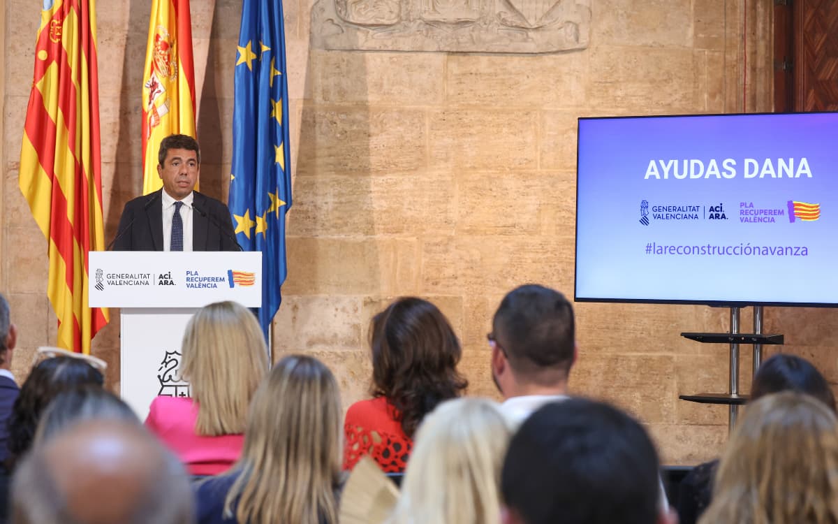 El president de la Generalitat Valenciana, Carlos Mazón, durante la presentación de las ayudas DANA. Imagen: Generalitat.
