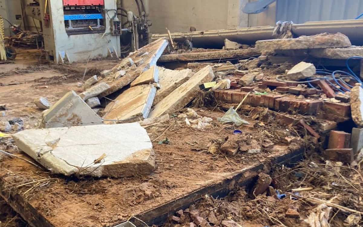 La escena se resume en una imagen familiar para muchos: los laterales de una nave derribados por una corriente de lodo que atraviesa la calle, toma la curva y se cuela con furia dentro de la empresa Cor Caroli Cerámicas, ubicada en el polígono de Ribarroja.