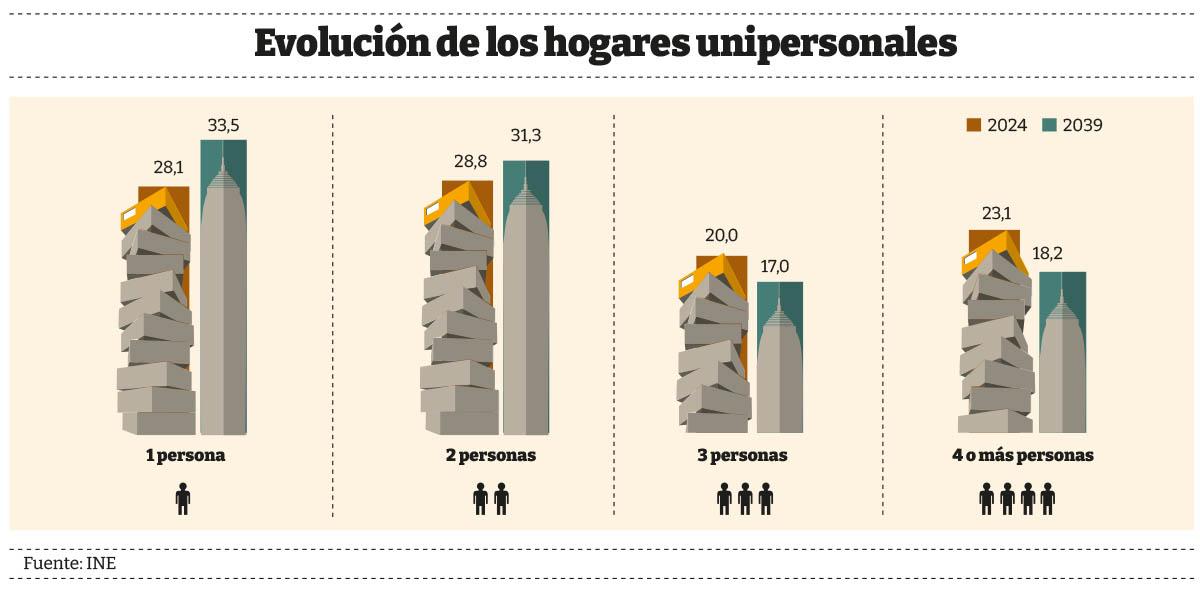 La mayor longevidad, unida a la baja natalidad, ha reducido progresivamente el tamaño medio de los hogares en España. Según datos del INE, en 1970 la media se acercaba a cuatro personas por vivienda; en 2021 se situó en 2,54 y las proyecciones indican que continuará bajando hasta 2,32 en 2039. Este proceso está provocando una mayor demanda de viviendas pequeñas, lo que genera un desajuste con el parque inmobiliario existente, aún orientado a unidades familiares más amplias.