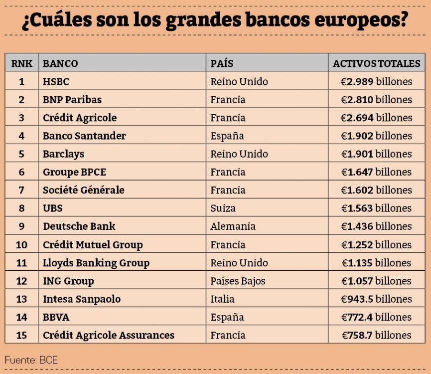 Esta década de fusiones ha dejado un rastro claro: un puñado de entidades se reparten el protagonismo. Europa está en manos de unos pocos. En cabeza está la británica HSBC, con casi tres billones de euros en activos y una red global que lo convierte en un gran jugador internacional. Francia es el otro gran epicentro, con BNP Paribas, Crédit Agricole, Groupe BPCE y Société Générale entre los mayores de Europa. Les siguen Deutsche Bank en Alemania; Santander y BBVA en España; Barclays y Lloyds en el Reino Unido; ING en Países Bajos; UniCredit e Intesa Sanpaolo en Italia; y UBS, reforzado tras absorber a Credit Suisse en Suiza.