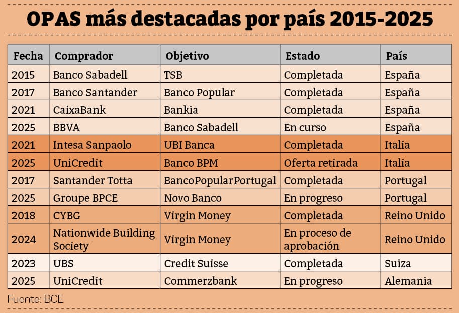 Entre las más sonadas, en la actualidad, como apuntábamos al principio de este reportaje, figura la OPA hostil lanzada por BBVA sobre Banco Sabadell en mayo de 2024, que avanza a trompicones entre condiciones regulatorias y debates sobre competencia.