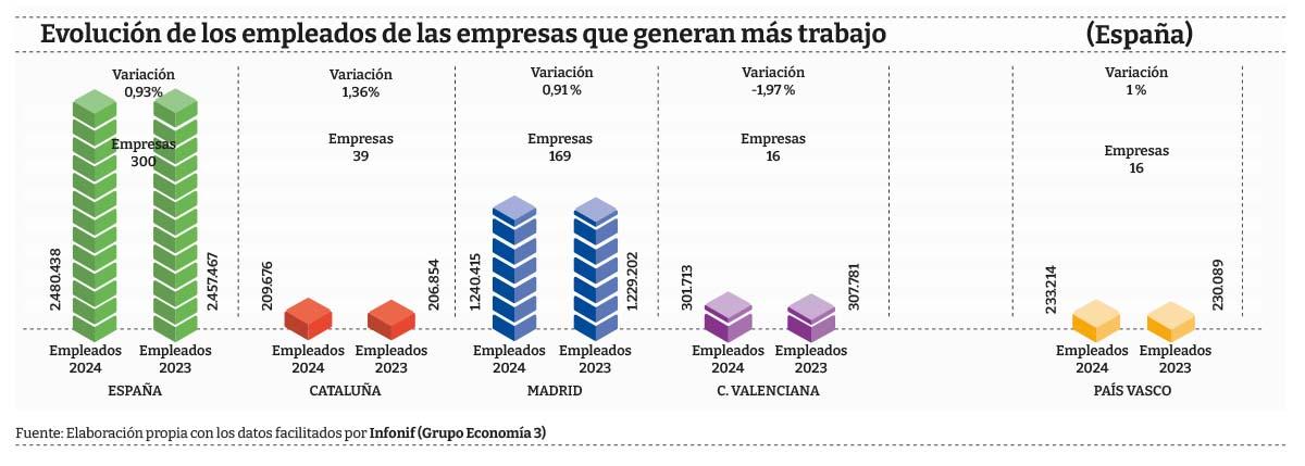 En 2024, las 300 empresas líderes dieron empleo a prácticamente dos millones y medio de personas, lo que supone un crecimiento del 0,93% con respecto al año anterior.