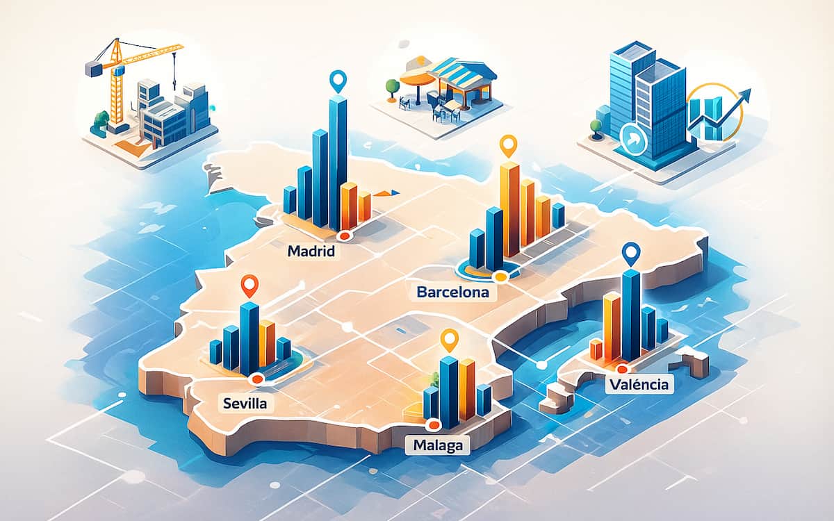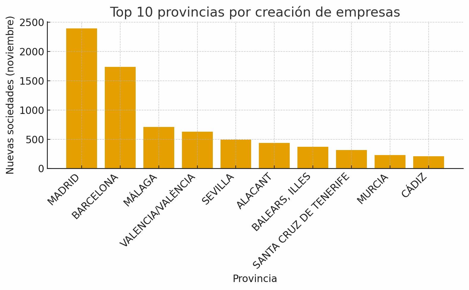 En el mapa territorial nacional, Madrid y Barcelona siguen siendo el gran motor de la creación de empresas en España. La capital del Estado sumó en noviembre 2.393 constituciones, el 21,4 % del total nacional, mientras que la provincia de Barcelona alcanzó 1.736 nuevas sociedades, un 15,5 %. Por detrás, se sitúan la provincia de Málaga (con 709 empresas, el 6,3 % del total), la provincia de Valencia (con 629, el 5,6 % del total) y Sevilla (con 495, el 4,4 %). Entre las cinco concentran más de la mitad (53,3 %) de todas las nuevas empresas del país.
