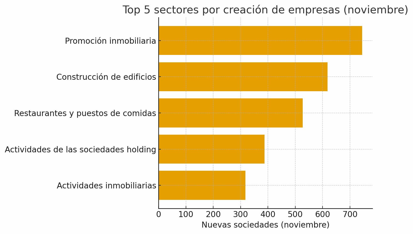Por sectores, el ladrillo y la hostelería continúan tirando del contador de nuevas sociedades. La promoción inmobiliaria lidera el listado con 745 empresas, seguida de la construcción de edificios (618) y de restaurantes y puestos de comidas (527). Juntas suman en torno al 17 % de todas las constituciones de noviembre.