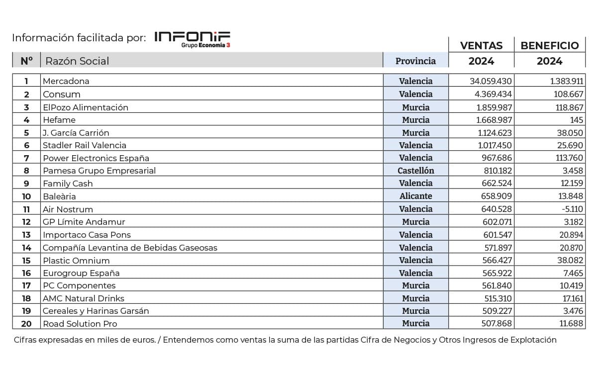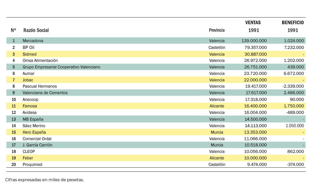 La información se procesó con un doble criterio: por cifra de facturación (ranking principal) y por orden alfabético (consulta). De ese primer análisis salían ya dos titulares contundentes. De las 200 empresas que aparecían en el listado, solo 19 alcanzaban o superaban los 10.000 millones de pesetas en ventas. Y, entre ellas, una desbordaba el listón: Mercadona superaba los 100.000 millones. El «club» de las mayores se concentraba en Valencia (14 compañías), con presencia también en Alicante (dos), Murcia (dos) y Castellón (una).