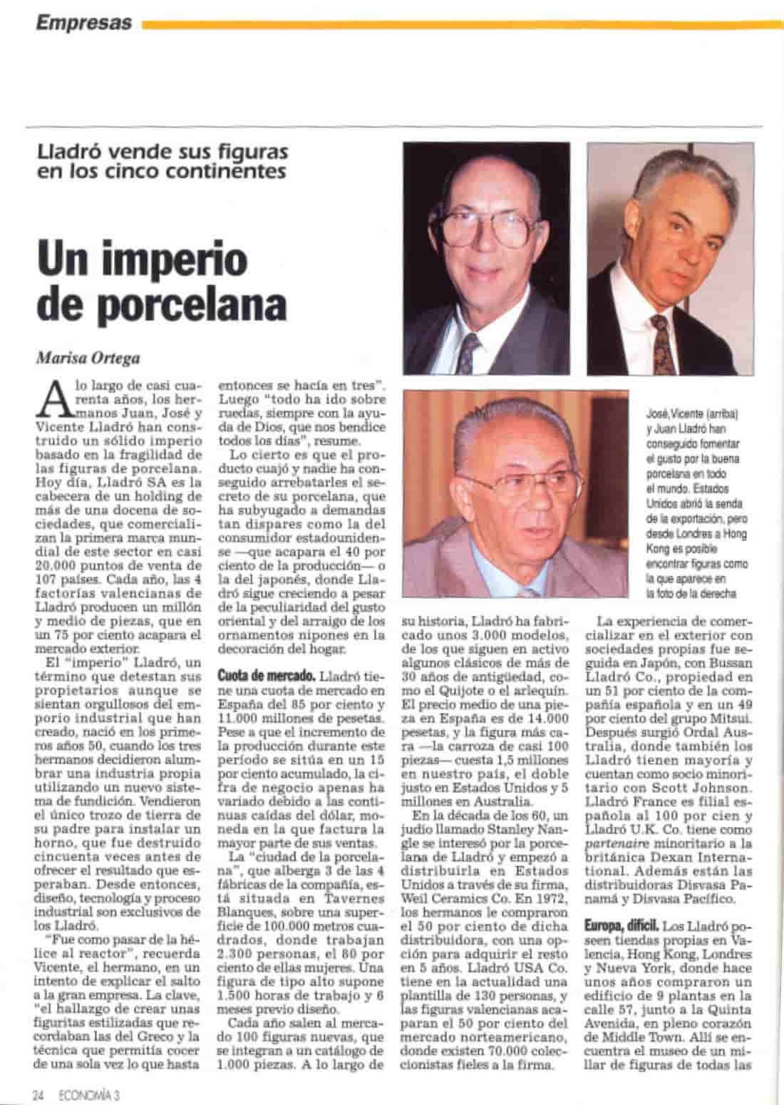 En diciembre de 1991, en el segundo número de la revista Economía 3, salía publicada una pieza titulada «Un imperio de porcelana». Aquel reportaje —uno de las primeras entrevistas a empresas que llevaba a cabo el medio— retrataba a Lladró en el momento en que su historia industrial, nacida en la Comunitat Valenciana, ya se había convertido en una de las marcas españolas más reconocibles fuera de nuestras fronteras.