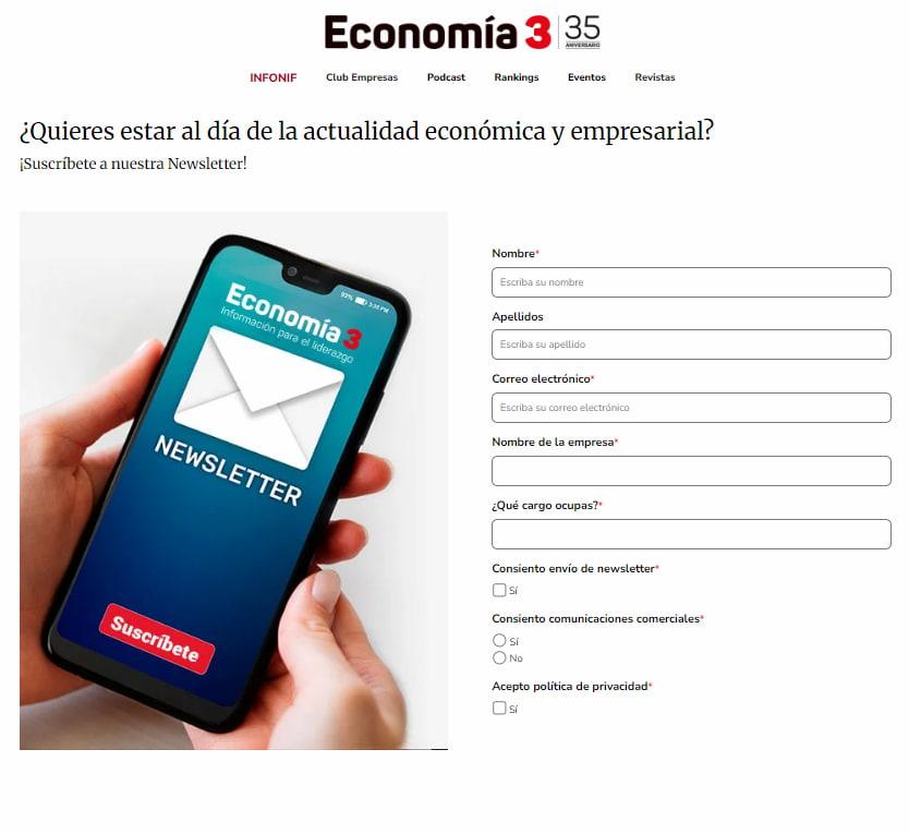 El acceso a esta herramienta es tan sencillo como su utilidad es estratégica. El proceso de alta en la newsletter de Economía 3 está diseñado para ser ágil y accesible para cualquier usuario, sin barreras técnicas ni requisitos complejos.