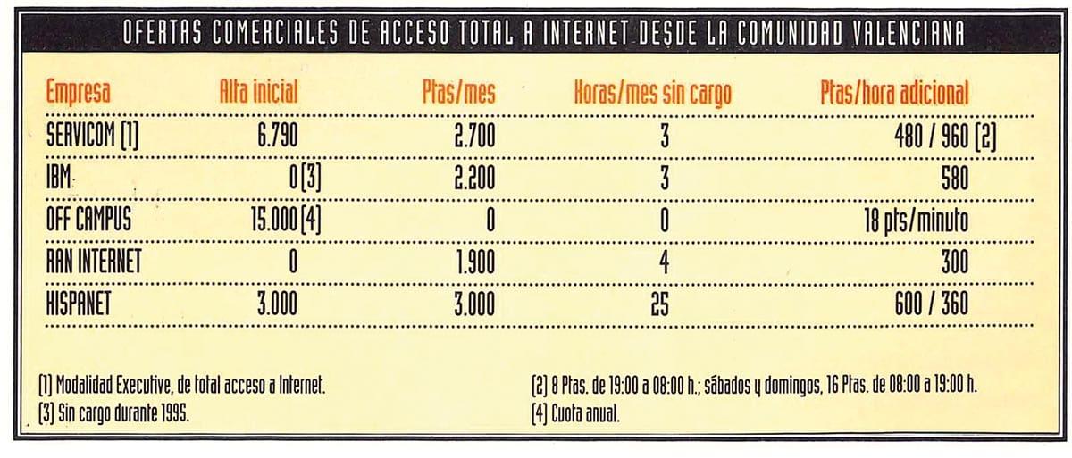 En paralelo, la conectividad se vertebraba a través de la Red IRIS, asociada a universidades y organismos públicos, mientras empezaba a despuntar un mercado de acceso privado que convertía la conexión en producto: proveedores, nodos, cuotas mensuales, bonos de horas y precios por minuto.