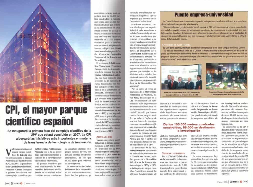 En marzo de 2005, Economía 3 informaba sobre la creación del mayor parque científico de España, previsto tras la finalización de las obras de la Ciudad Politécnica de la Innovación (CPI), que concluirían en 2007. Dos décadas después, este complejo se ha consolidado como uno de los principales motores de innovación, transferencia tecnológica y desarrollo empresarial del país.