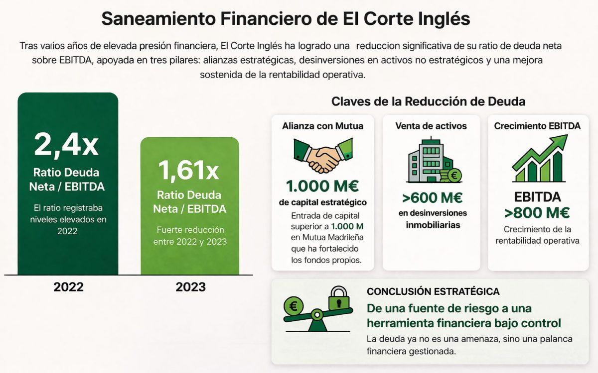 Las cifras muestran que la empresa ha reducido su deuda y ha mejorado sus beneficios. Mantiene niveles de solvencia estables y presenta un balance sin tensiones financieras relevantes en comparación con años anteriores. Tras este proceso de ajuste financiero, la compañía opera en un entorno competitivo y con márgenes reducidos. En definitiva, el Corte Inglés ha completado una fase de reducción de deuda y saneamiento financiero, y se encuentra en una etapa posterior dentro de su evolución económica.