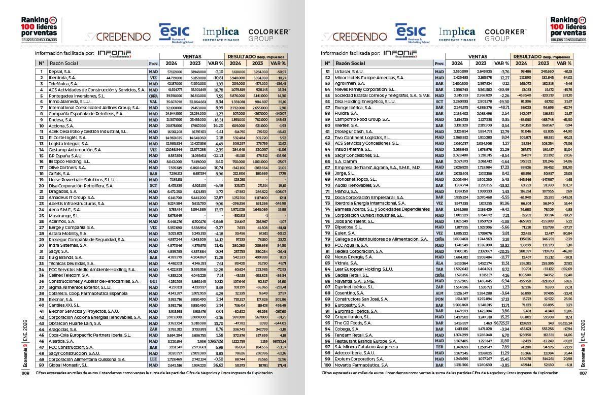 Pero los resultados de las diez primeras con respecto a 2023 sí que ha crecido a doble dígito, un 13,03% hasta los 21.394 M€. Igualmente, estos resultados suponen el 59% del total de las 100 compañías consolidadas que recoge este ranking.